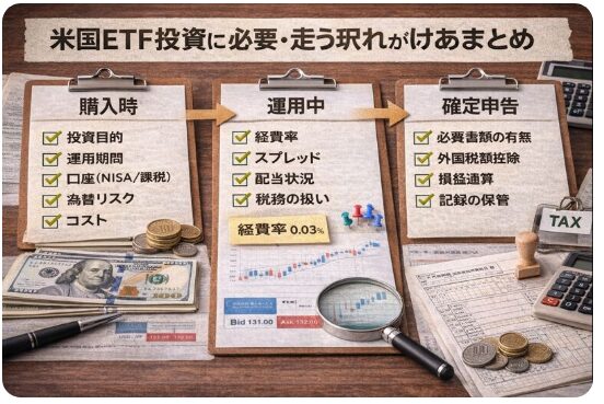 米国ETF投資は、商品選びだけでなく、購入前・運用中・確定申告まで一連の流れを管理できるかで成果が大きく変わります。