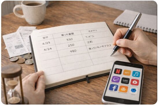 - 固定費削減が最速:ノートで見つける“毎月勝手に増えるお金”(サブスク・通信費・保険)