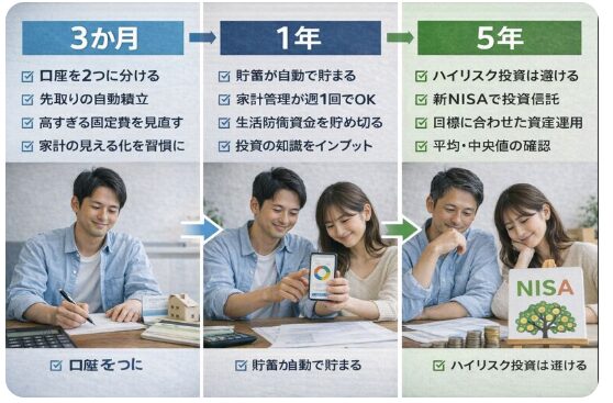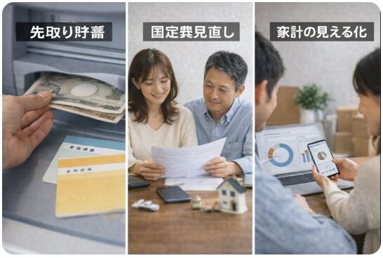 口座分け・自動積立・固定費見直し・家計の見える化といった具体的な行動リストも整理。
