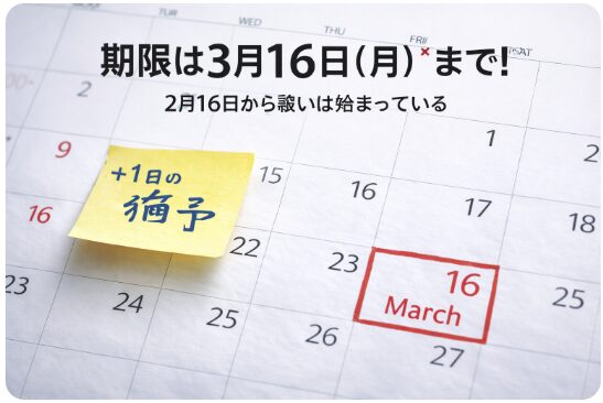 - 今年のポイント: 例年は3月15日が期限ですが、今年は日曜日のため翌16日(月)が最終日となります。