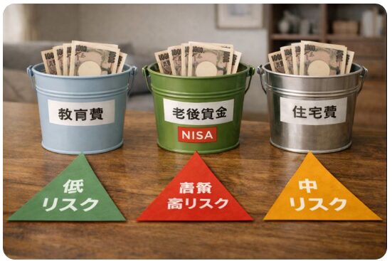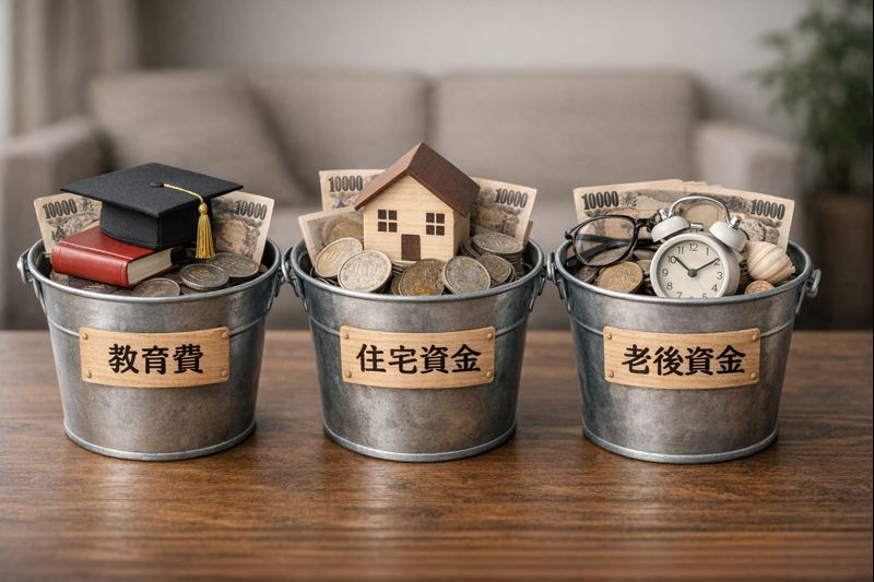 教育費・住宅・老後といった目的ごとに「バケツ」を分け、使う時期に合わせて貯め方・運用の仕方を変える考え方です。これだけで、将来のお金が一気に整理されます。