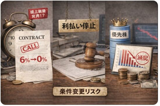 - リスク③ 条件変更:繰上償還・利払い停止・減配(目論見書で必ず拾う)