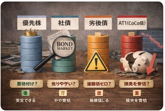 実は、優先株・社債・劣後債・AT1(CoCo債)はそれぞれ性質が大きく異なり、リスクや扱い方も全く違うんです。