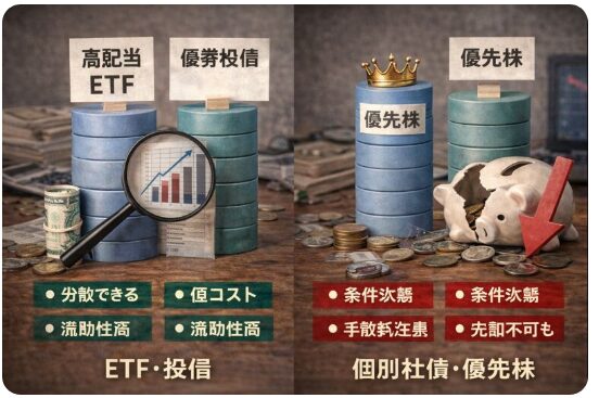 - 代替手段と実務:ETF・投資信託・個人向け社債の使い分け(初心者ほど重要)