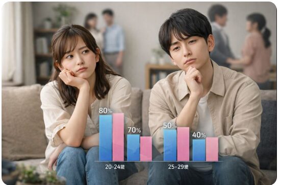 20代後半でも、男女合わせて結婚している割合は3〜4割程度にとどまるというデータがあります。未婚の割合は圧倒的に高く、20代はそもそも「結婚前のライフステージ」という側面が強いんです。