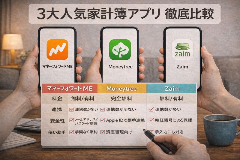 この記事では、2026年時点で利用者の多い「マネーフォワードME」「Moneytree(マネーツリー)」「Zaim」の3つを中心に、料金・連携・安全性・使い勝手を徹底比較します。