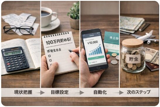 この記事では、現状の可視化→毎月の貯金額設定→自動化の仕組み→そして100万円達成後の次のステップまでを、一気通貫でわかりやすく解説します。