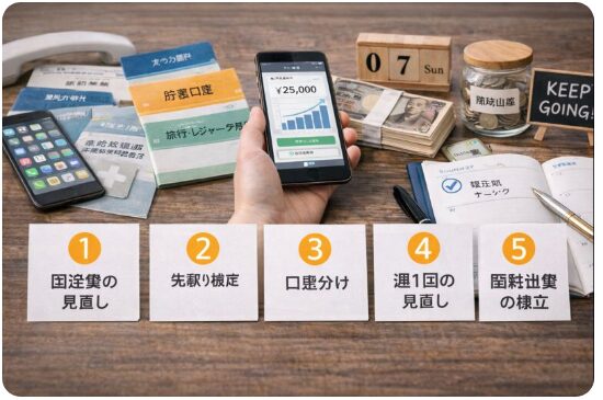 固定費の見直し、先取り設定、口座分け、週1回の見直し、臨時出費の積立。