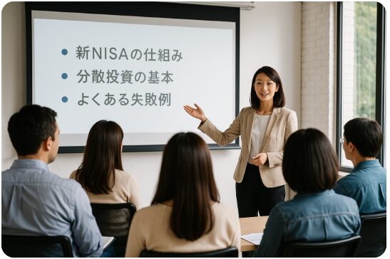 特に、「新NISAの仕組み」「分散投資の基本」「よくある失敗例」などをテーマにした講座は、実践に直結する内容が多く、投資経験がない人にもわかりやすいのが特徴です。ここが重要! セミナーを選ぶときは、初心者向けかどうか、具体的なカリキュラム内容、そして講師の実績をしっかりチェックすること。