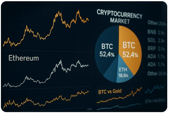 仮想通貨市場を理解するうえで欠かせないのが、ビットコインと主要アルトコインの関係性や相場全体の動向です。例えばイーサリアム(ETH)は、DeFiやNFT市場の成長とともに存在感を増し、時にナスダックなど株式市場と相関する場面も見られます。また、ビットコインは「デジタルゴールド」と呼ばれるように、金価格との比較でも注目されています。