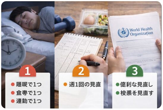 例えば、今夜は少し早く寝る、食事でたんぱく質を意識する、5分だけ歩く。