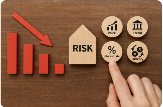 代表的なリスクには、株価や債券価格の上下による価格変動リスク、企業や国の信用が揺らぐ信用リスク、金利の変化による金利リスク、そして円安や円高の影響を受ける為替リスクがあります。