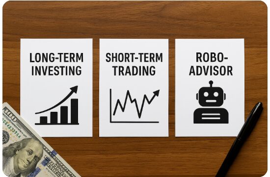 投資の方法にはさまざまなスタイルがありますが、初心者がまず理解しておきたいのは**「長期投資」「短期取引」「ロボアドバイザー活用」**の3つです。それぞれ特徴やリスクが異なり、自分に合った方法を選ぶことで投資の成果は大きく変わります。