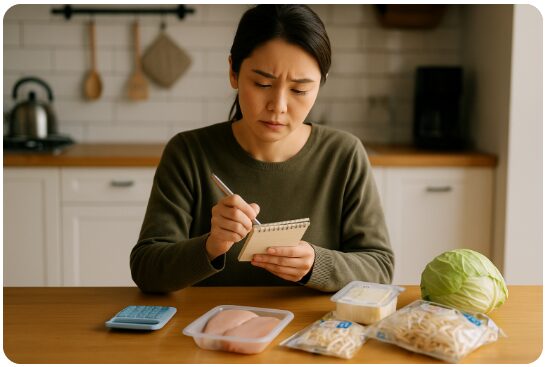 業務スーパーや特売を活用し、1週間分の献立をまとめて考えるだけで、ムダ買いと外食費をWでカットできます。