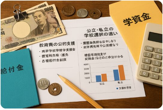教育費の負担を大きく左右するのが、公的支援制度の活用と学校選択の違いです。近年は高校無償化や授業料減免、各種給付金制度が充実しており、条件を満たせば家計の負担を大幅に軽減できます。