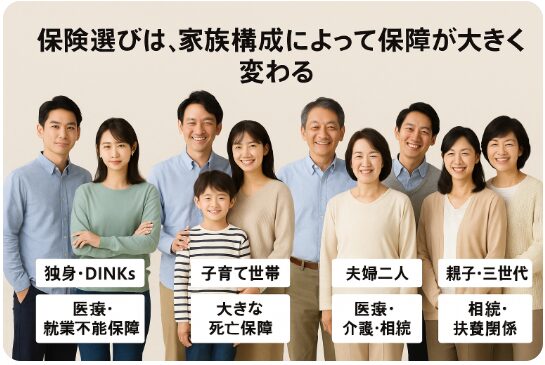 保険選びは、**家族構成によって必要な保障の内容や金額が大きく変わる**のが特徴です。独身やDINKs(共働きで子どもなし)であれば、死亡保障よりも医療保険や就業不能保障を重視するケースが多いですよね。一方で子育て世帯では、教育資金や住宅ローンをカバーするために大きな死亡保障が必要となります。
