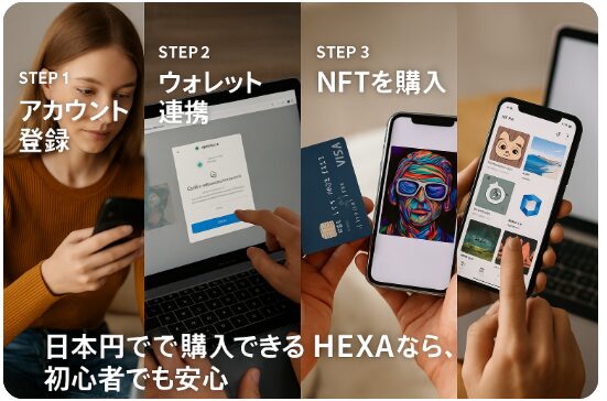 NFTに興味はあるけれど、「仮想通貨を買うのはちょっと不安…」という方は多いですよね?実は、日本円だけでNFTを購入できるサービス 「HEXA(ヘキサ)」 が登場し、初心者でも安心して取引を始められる環境が整ってきています。