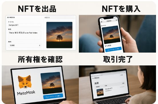 また、HEXAはクレジットカードでそのままNFTを購入できる仕組みを採用。仮想通貨を用意しなくても、日本円決済で取引できるのが大きなメリットです。購入フローや決済時の注意点を押さえておけば、誰でもスムーズにNFTデビューが可能になります。