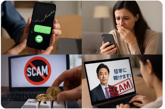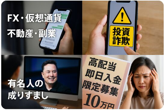 特に近年は、FX・仮想通貨・不動産・副業 など多様な分野で「簡単に儲かる」と装った手口が急増しています。