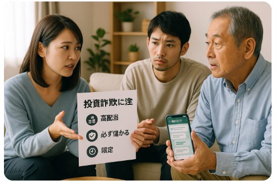 特に高齢者や投資初心者は、SNS広告やLINEグループ勧誘にだまされやすいため、家族のサポートが欠かせません。事前に「詐欺の見分け方」を教育テンプレートとして伝えておけば、怪しい話を持ちかけられても冷静に判断できるようになります。