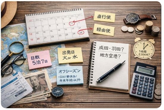 航空券は総額で比較し、日程や出発地を柔軟に考える。
