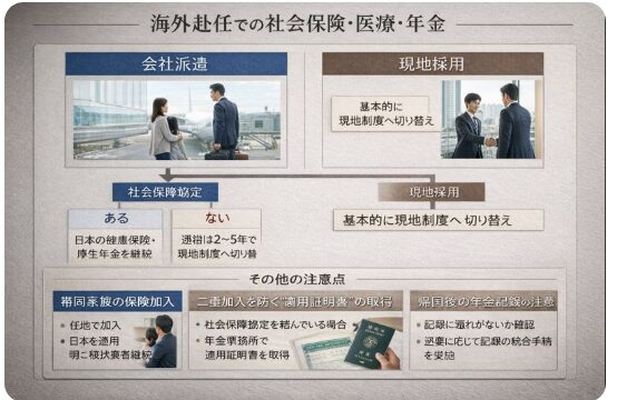 3. 社会保険・医療・年金の扱い:脱退ではなく「協定・加入区分・会社制度」で最適化