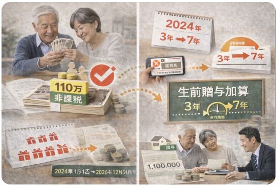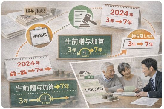 そして、2024年(令和6年)からの大きな変更点である、生前贈与加算の対象期間が「3年 → 7年」へ延長された仕組みを、いつから・どこまで対象になるのかを具体的に整理します。
