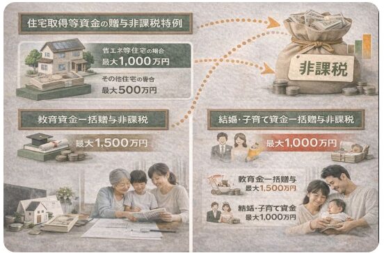 - 非課税特例の使い分け|住宅・教育・結婚/子育て資金で“合法的に枠を増やす”