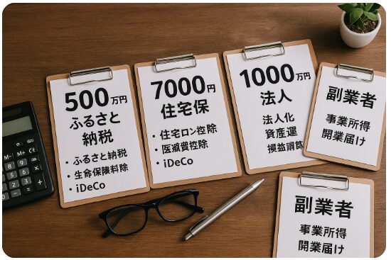 たとえば、個人事業主なら経費計上と青色申告、会社員なら控除とふるさと納税、法人なら報酬設計・社宅・退職金といった制度を活用することで、確実に税負担を軽くできます。