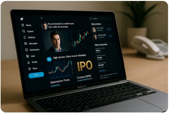 「○○さんも投資している!」「テレビで話題のAI投資」などの文言で信頼を装い、
