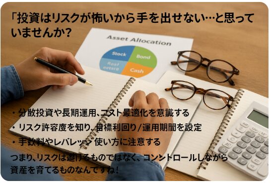 実は、リスクを正しく理解し、管理することこそ資産形成を成功させるカギなんです。投資にリスクはつきものですが、分散投資や長期運用、コストの最適化を意識すれば、そのリスクを抑えながら資産を増やすことができます。