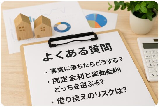 住宅ローンやフラット35を検討していると、「審査に落ちたらどうする?」「固定金利と変動金利どっちを選ぶ?」「借り換えのリスクは?」 といった疑問が必ず出てきますよね。これらは多くの人が共通して抱える不安であり、事前に知識を持っておくことで安心して住宅購入を進められます。